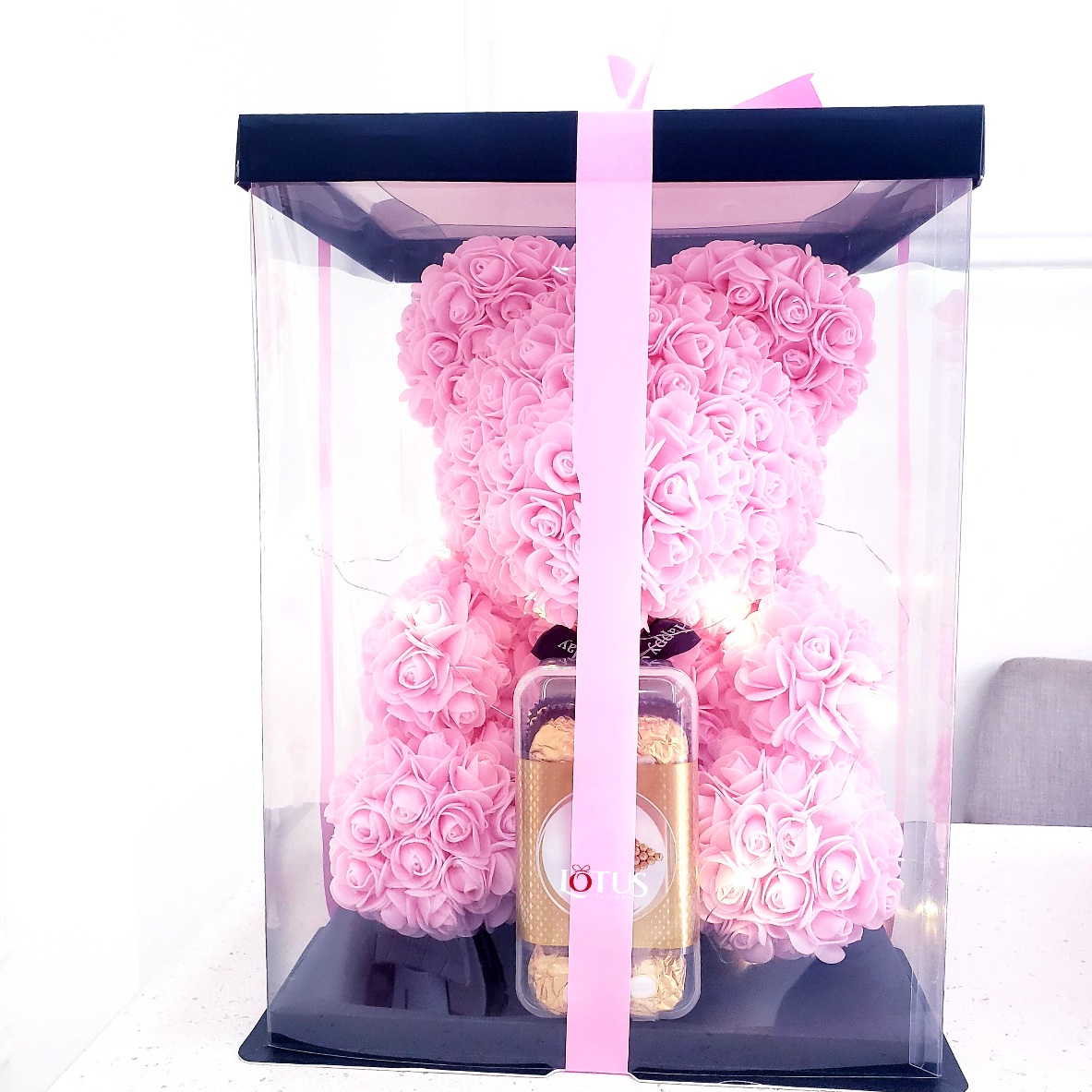 Rose bear with fairy light and ferrero rocher chocolate
