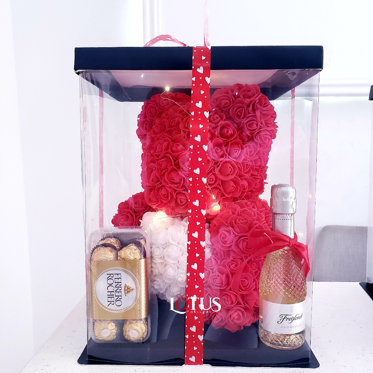 Rose bear with fairy light, ferrero rocher chocolate and freixenet prosecco