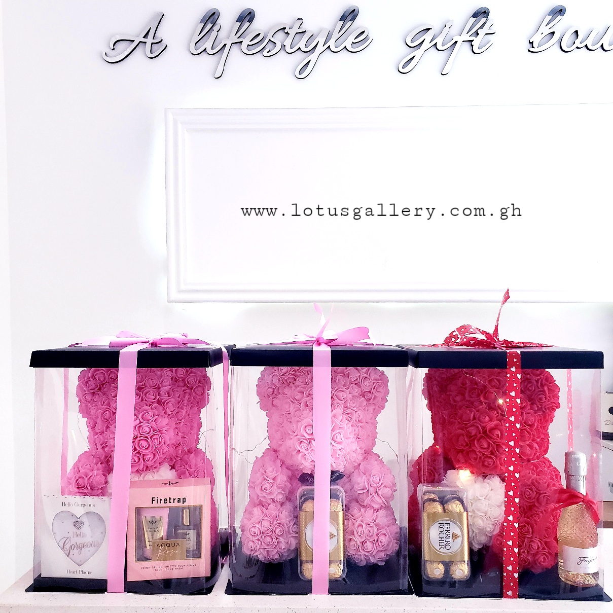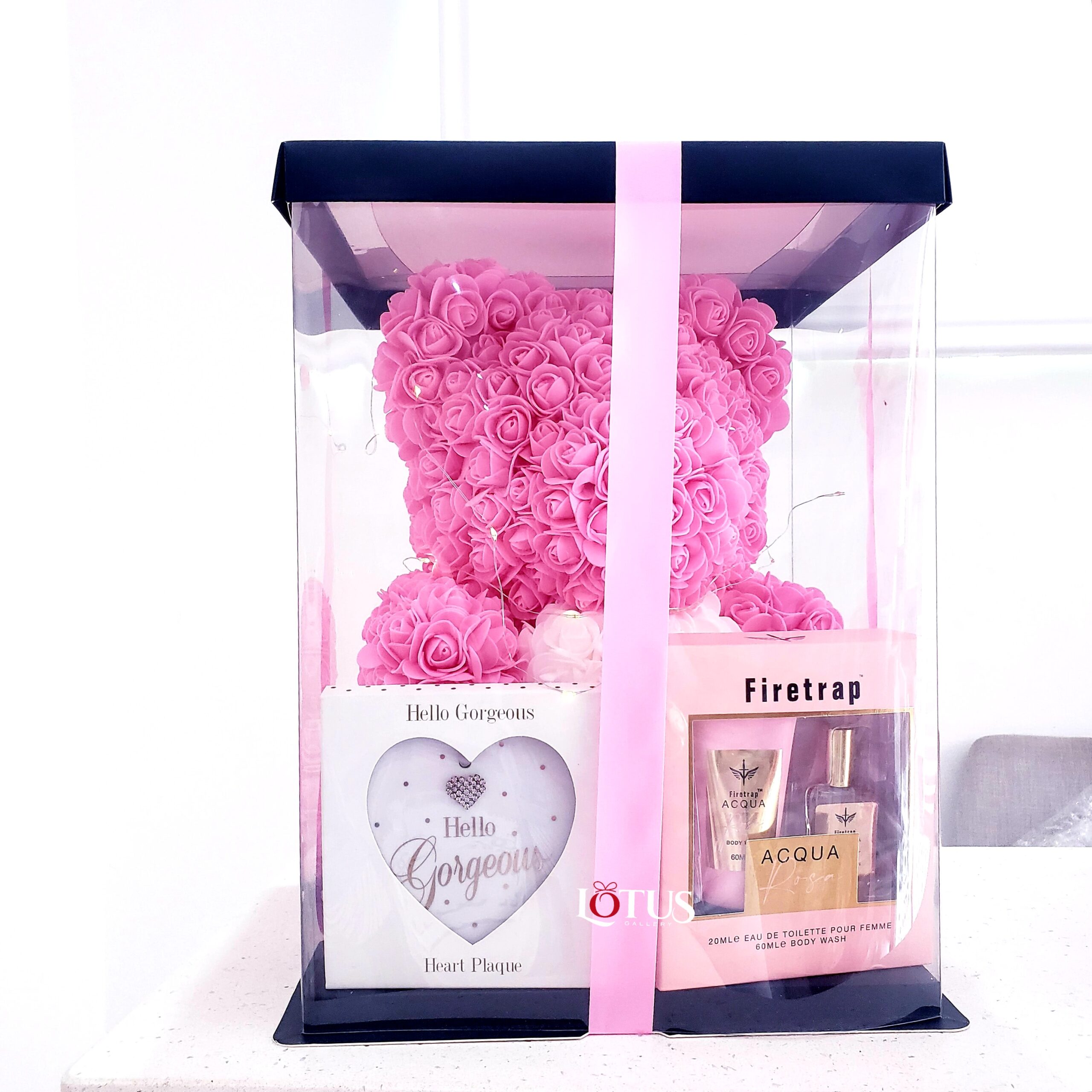 Rose bear with fairy light, hello gorgeous plaque and firetrap perfume n body lotion